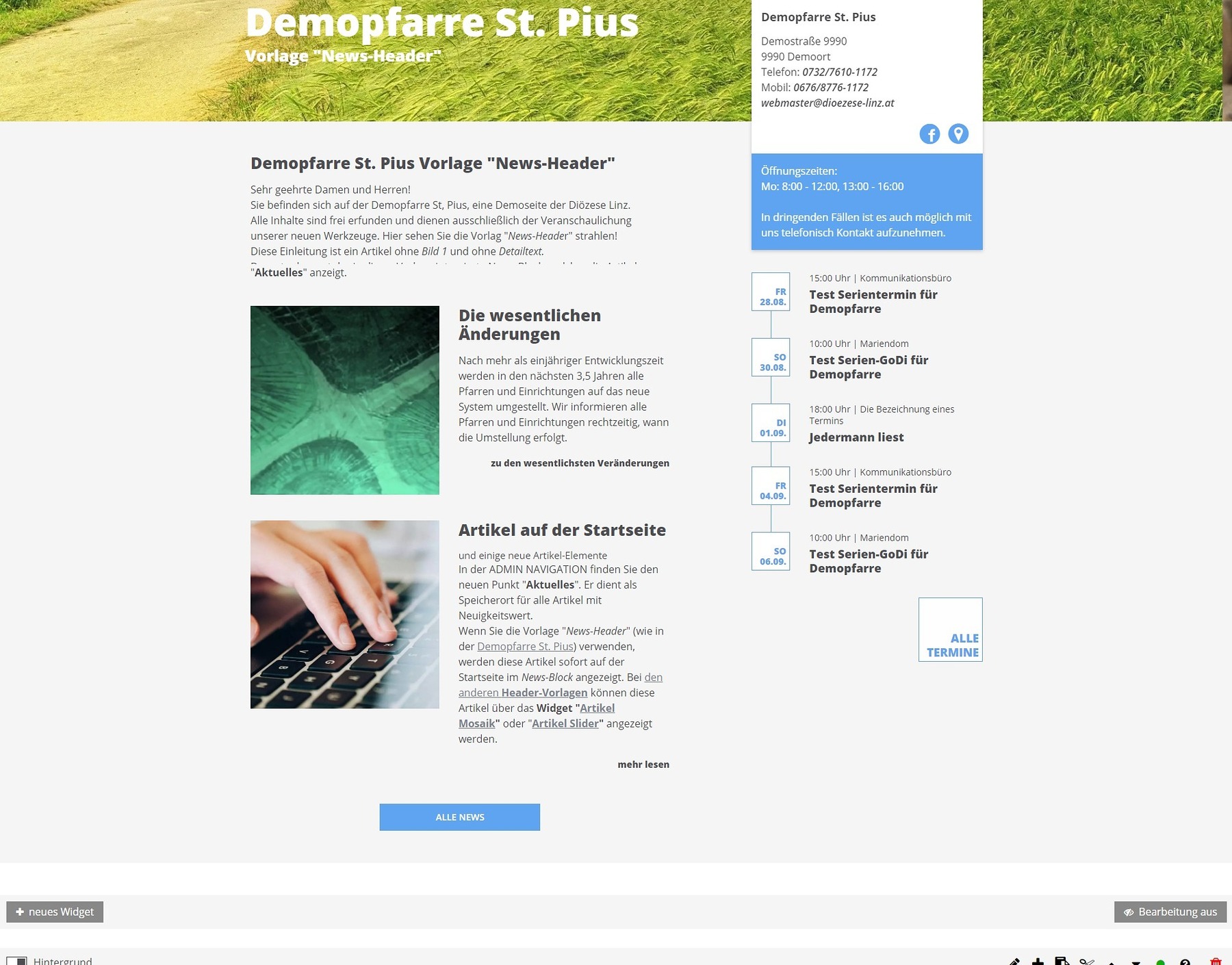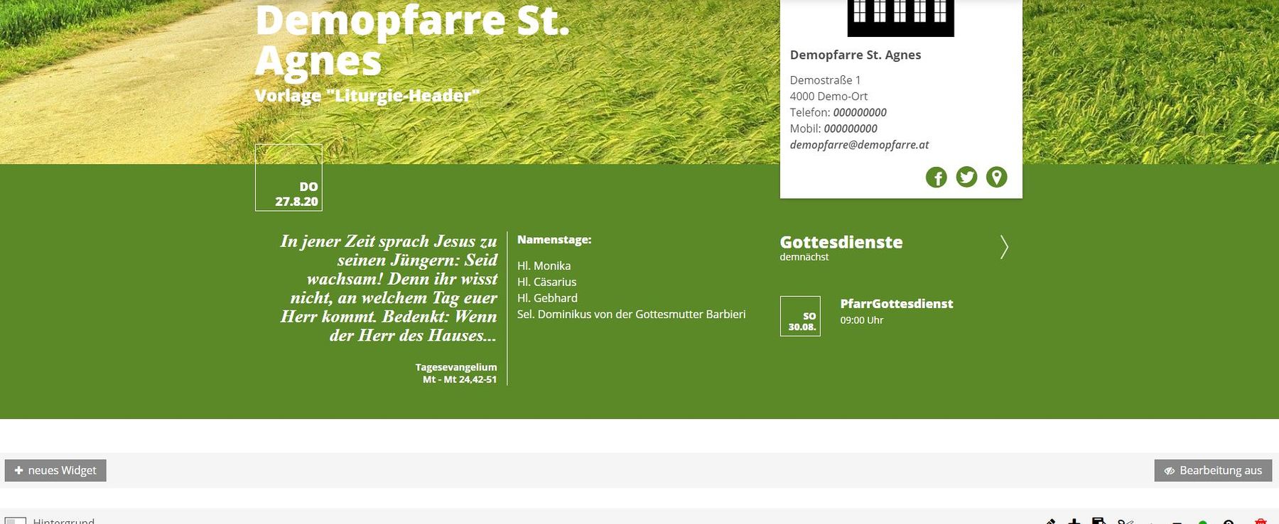 Jede Startseite im aktuellen Design ist automatisch eine Widgetseite. Darüber hinaus können Sie, je nach verfügbaren Inhalten Ihrer Pfarre/Einrichtung/...  weitere Widgetseiten anlegen.