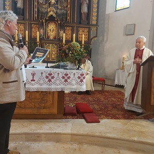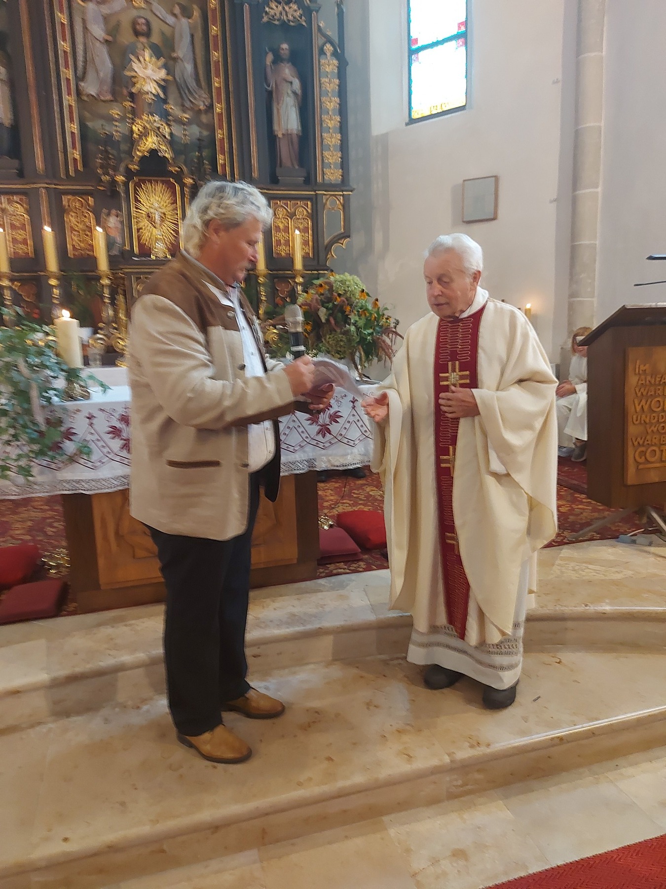 Der Hl. Bartholomäus, der Kirchenpatron der Pfarrgemeindekirche Esternberg, hat seinen Namenstag am 24. August - am darauffolgenden Wochenende findet daher immer der Kirtag statt. Da die Gemeinde Esternberg den Kirtag neu belebt hat, wollte nun auch die Pfarrgemeinde diesen Ehrentag, das Patrozinium, wieder etwas mehr hervorheben. Pfarrer Eduard Bachleitner feierte mit uns eine schöne Messe, die Trachtenmusikkapelle St. Roman/ Esternberg umrahmte dieses schöne Bild. Am Ende der Messe wurden einige Ehrungen vorgenommen. Pfarrer Eduard Bachleitner bedankte sich bei unserem „Altpfarrer“ Franz Kessler für sein mehr als 40-jähriges Wirken und für seine Bereitschaft, auch im Ruhestand Messen mit uns zu feiern, mit einem Gutschein für „Klassik am Dom“. Alois Jungbauer dankte Johann Kothbauer und Martin Fesel für die Arbeit als PGR-Obmänner, Maria Behnisch und Gisela Fuchs für jahrelanges Vorbeten und Maria Kaiser und Franziska Kropfmüller für den Blumenschmuck in der Kirche. Blumensträuße und Geschenkkörbe wurden überreicht, nur kleine Aufmerksamkeiten für wertvolle Dienste