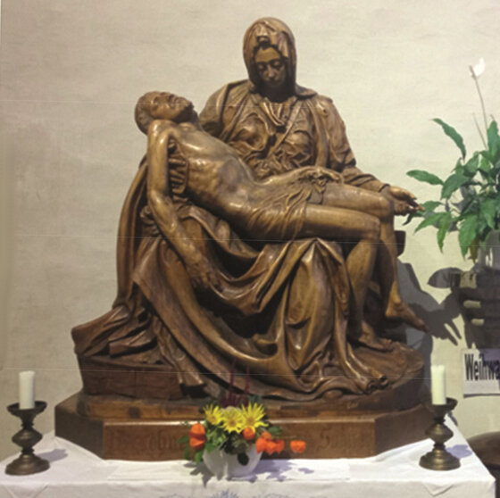 Die eine wurde von dem berühmten Bildhauer Michelangelo Buonarroti um 1500 aus einem einzigen Carrera-Marmorblock geschaffen. Die andere besteht aus Lindenholz, gefertigt um 1926 vom Schnitzmeister August Klein und 1930 in der damals neu angebauten Beichtkapelle aufgestellt. Im Jahr 1986 wurde die Beichtkapelle umgestaltet. Seither steht die Pieta am linken Seitenaltar in der Kirche.