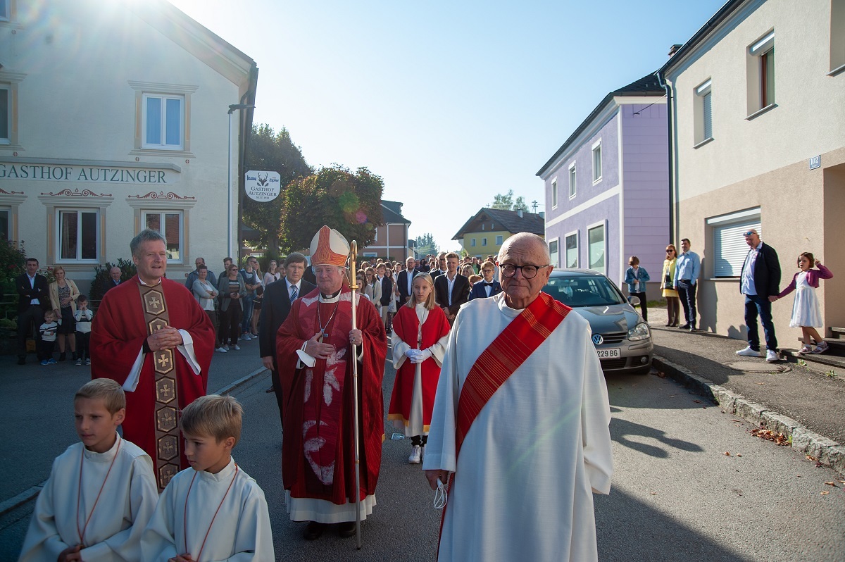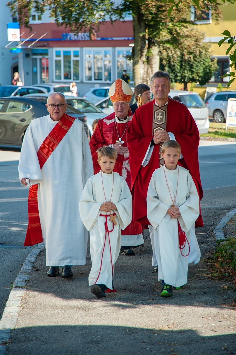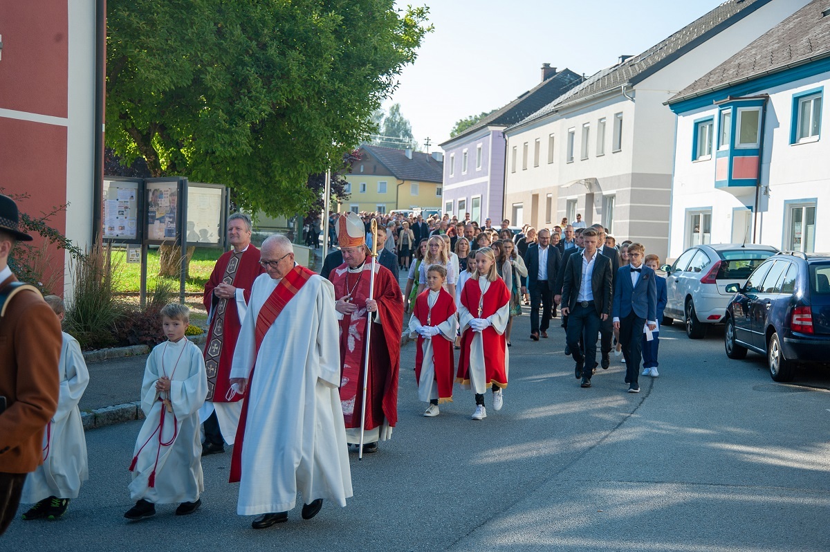 Am Samstag, 25. September durften wir Bischof Manfred Scheuer als Firmspender in unserer Pfarre begrüßen. Bei sonnigem Spätsommerwetter begleitete der Musikverein den Festzug zur Kirche, wo unser Kirchenchor für die feierliche musikalische Gestaltung der Festmesse sorgte. Anschließend stand unser Bischof noch für ein Gruppenfoto und Einzelfotos zur Verfügung.