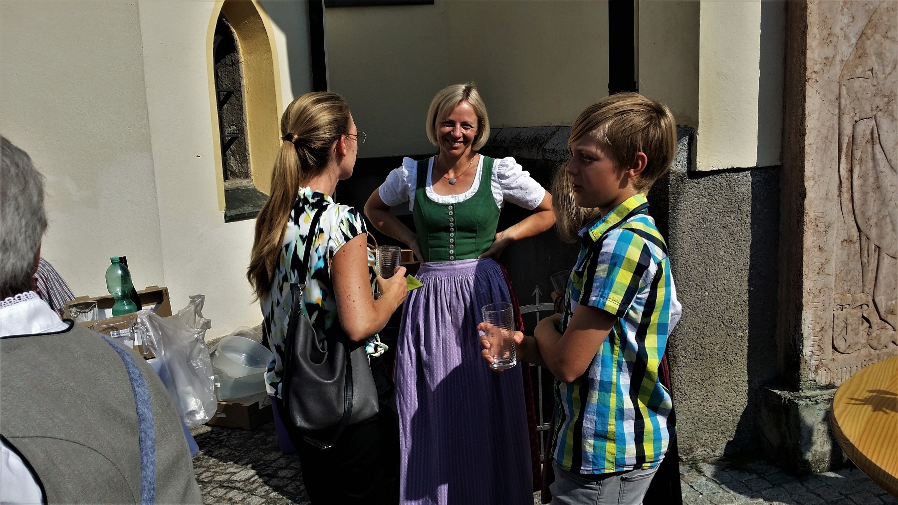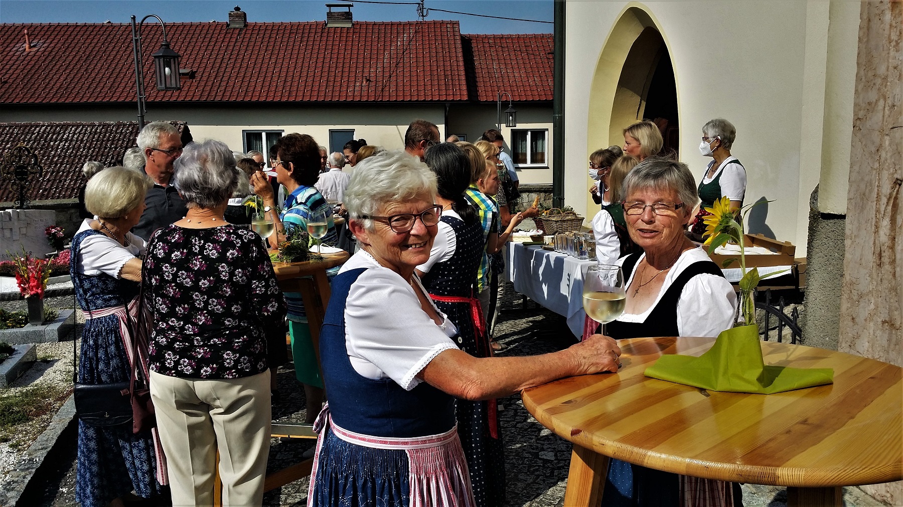 Kräutersalz und Lavendel-Duftsäckchen wurden bei der anschließenden Agape von den Goldhaubenfrauen zum Verkauf angeboten. Süßes Gebäck, Getränke und Wein rundeten für die zahlreichen Kirchenbesucher den schönen Ausklang bei sonnigem Wetter ab.