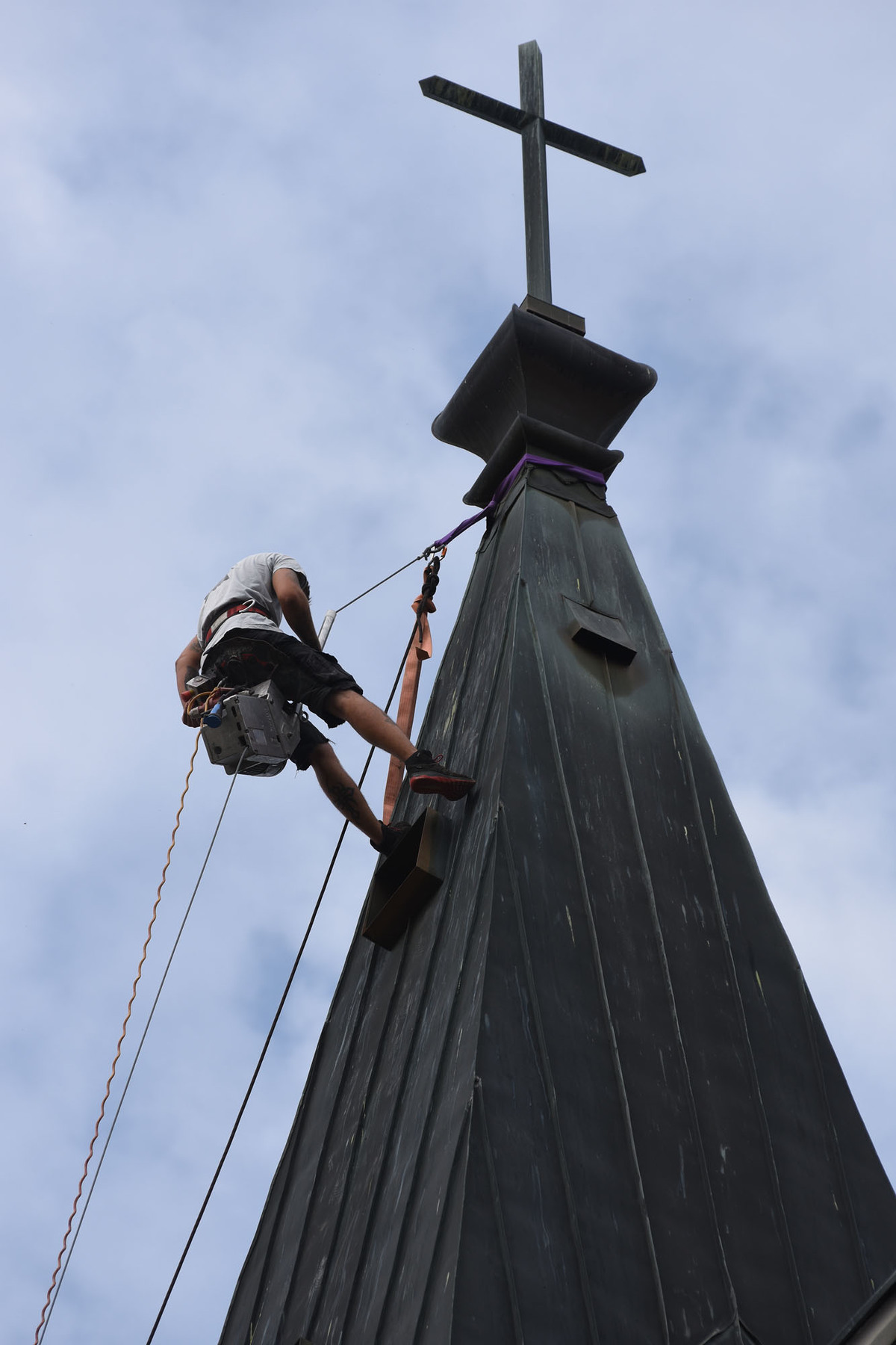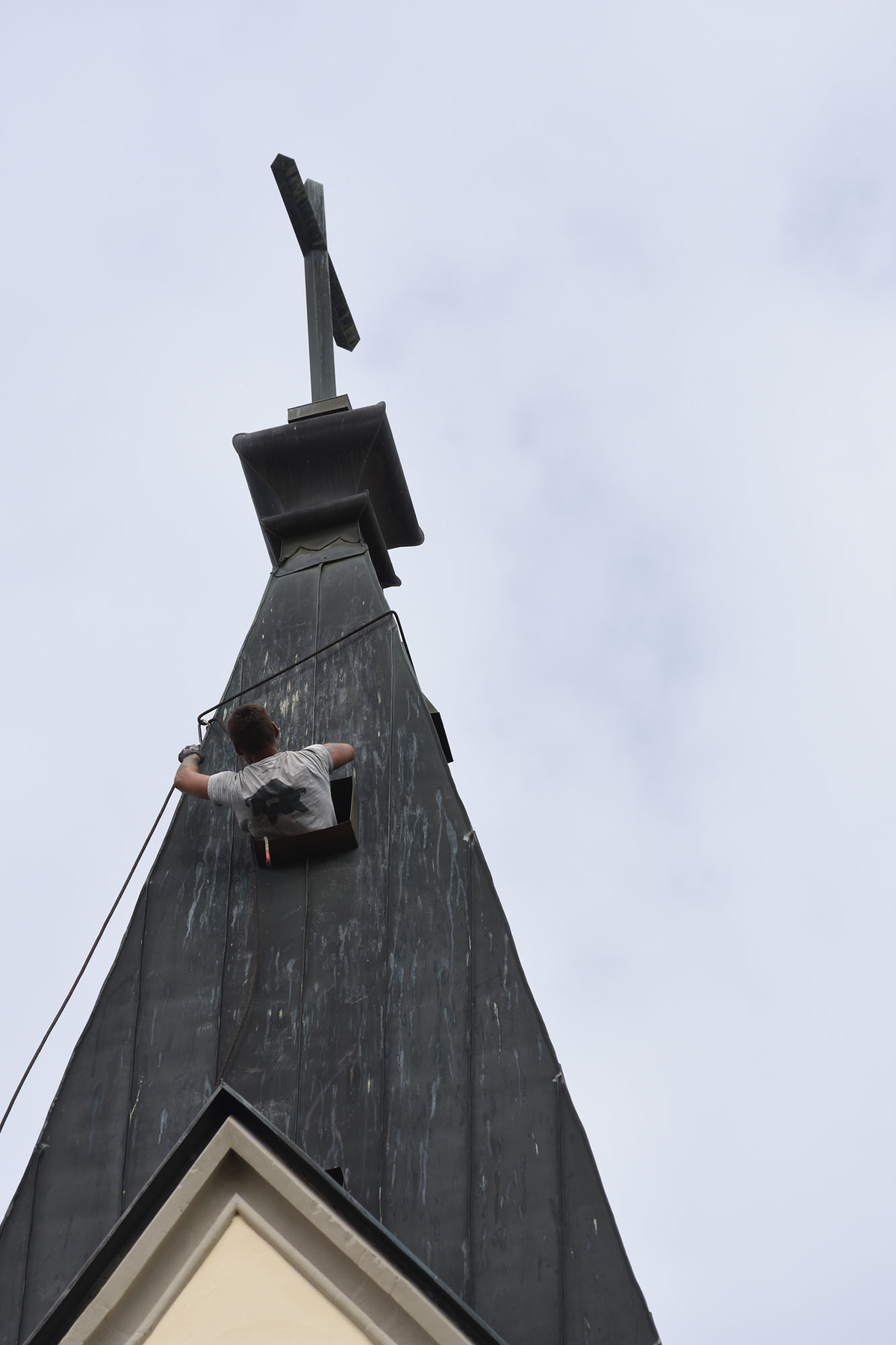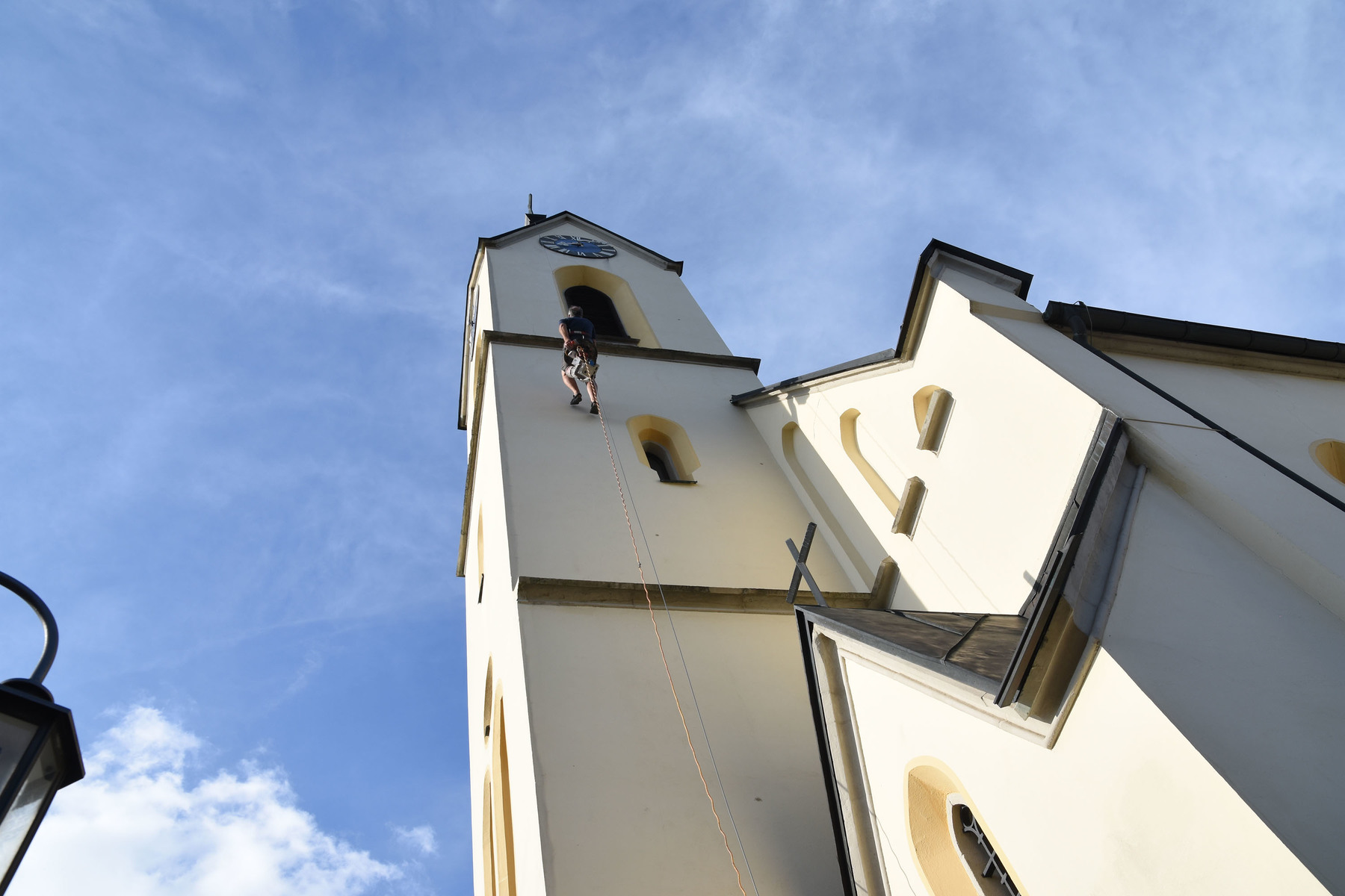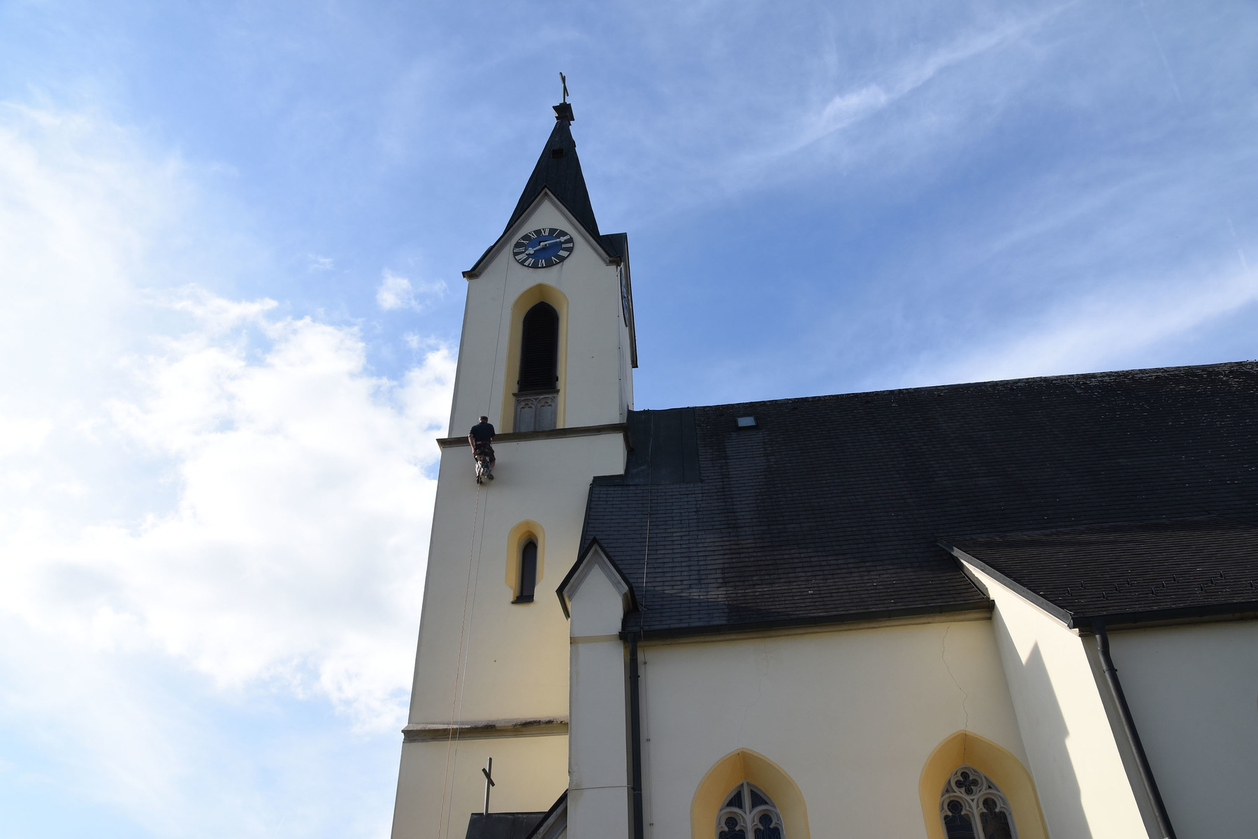 Schon von Weitem waren in der KW 34 die sehr erstaunlichen und artistisch anmutenden Arbeiten am Kirchturm unserer Pfarrkirche zu sehen, die von der Firma Mayerl GmbH aus Dölsach in Osttirol durchgeführt wurden.